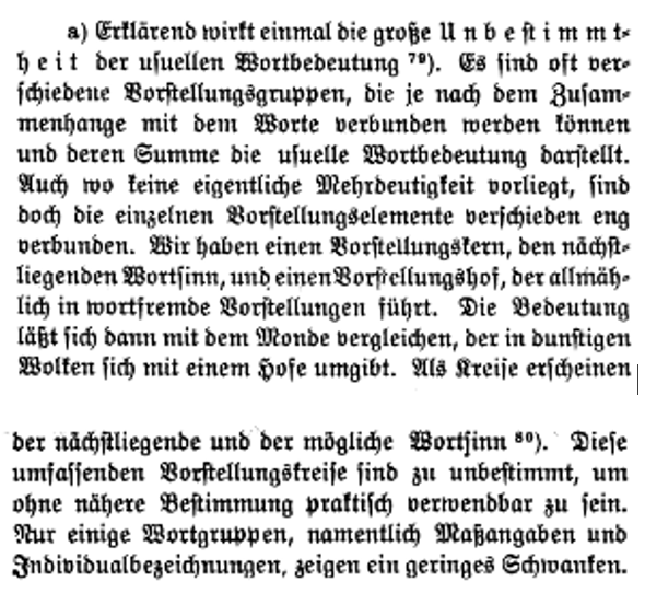 Da wird also von „Vorstellungskern“ und „Vorstellungshof“ gesprochen und explizit das Beobachtungsbild des Mondes zur Veranschaulichung herangezogen. Die Betrachtung des Einleitungsbildes zu diesem Beitrag zeigt deutlich, wie sich an den „Kern“ der „Hof“ anschließt, „der allmählich in wortfremde Vorstellungen führt“.